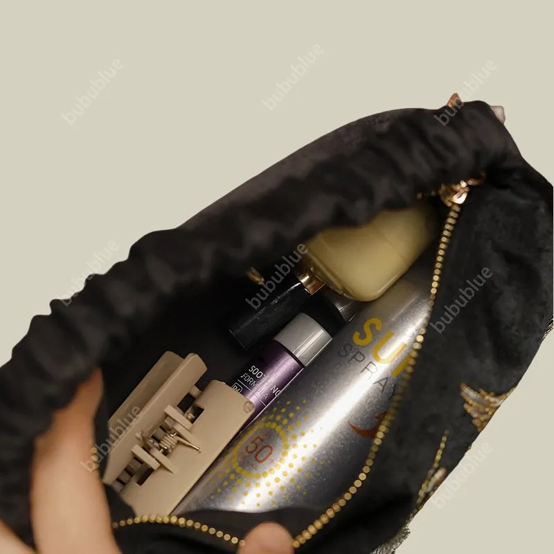 This black crane embroidered evening bag blends artistry with timeless elegance. Handcrafted with intricate crane embroidery symbolizing grace and freedom, it features a soft elastic handle and secure zipper closure. A refined piece for both daily elegance and special occasions.