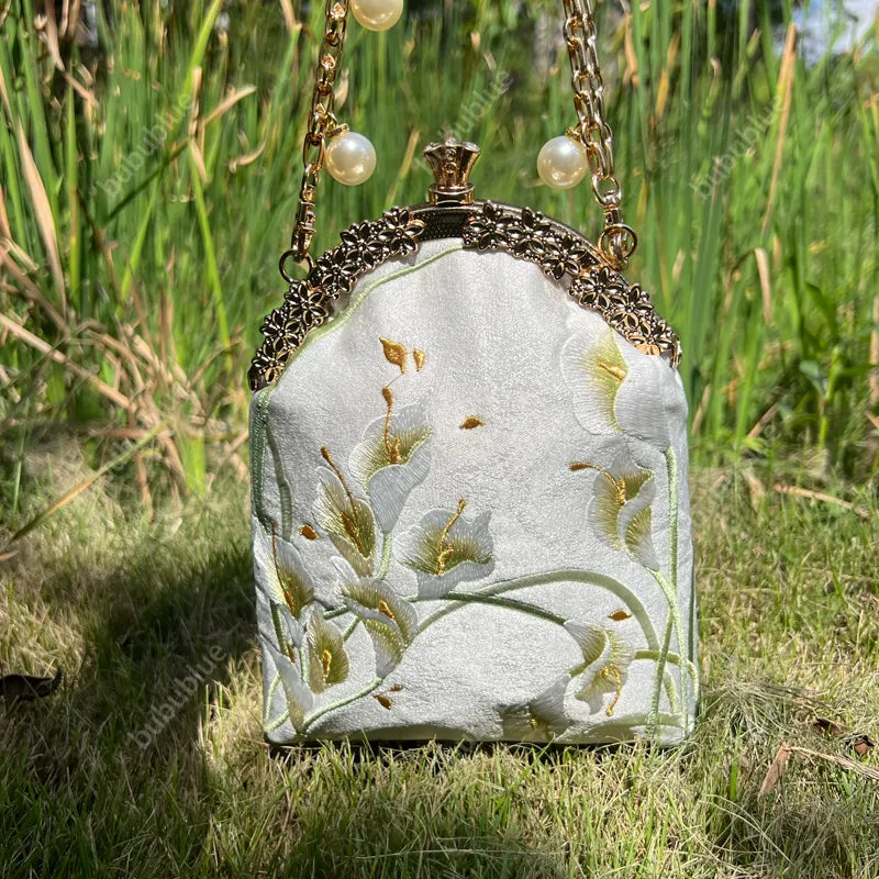 Carry fairy-tale charm with this Calla Lily Embroidered Handbag. Featuring pearl chain accents, crown-style clasp, and floral embroidery, it’s a perfect choice for those seeking a unique floral purse with both elegance and practicality.