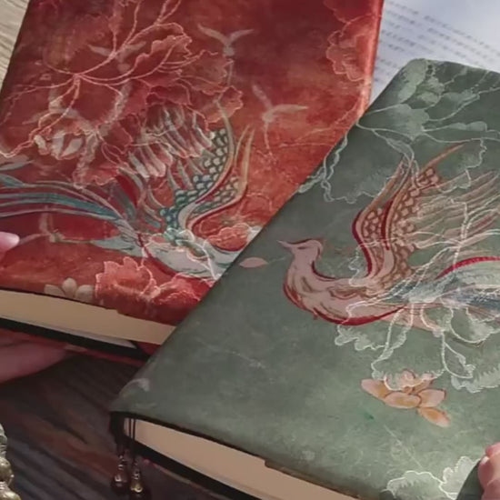 This design draws from ancient nature myths, with flowing lines outlining a phoenix rising in warm orange and soft green. The embroidery echoes vintage East-Asian artistry, paired with jacquard textures and a romantic, mythical spirit. Each cover is hand-stitched, unique, and full of gentle, timeless charm.