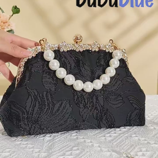 This black embroidered handbag with a pearl handle blends elegance and function. Featuring floral stitching, a sparkling clasp, and convertible straps, it's your go-to from dinner to dance. Perfect for adding charm to any outfit.