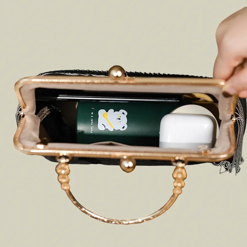 This black floral embroidered evening bag features delicate pearl tassels, a vintage gold frame, and soft garden-inspired embroidery. Elegant and roomy enough for essentials, it’s a graceful vintage purse for formal dinners, dates, or special occasions.