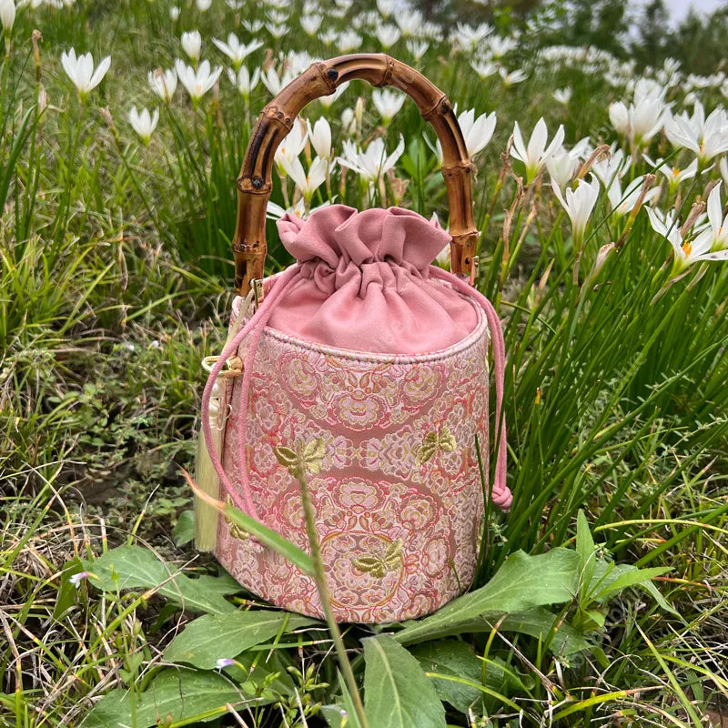Golden Butterfly Embroidered Bucket Bag(Pink/Purple)