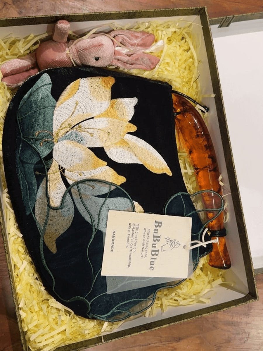 This lotus embroidered handbag features a playful fish-shaped handle and 3D lace lotus leaves on soft satin. With secure zipper closure and roomy interior, it’s a calm, nature-inspired piece that adds charm to everyday or dressy outfits.