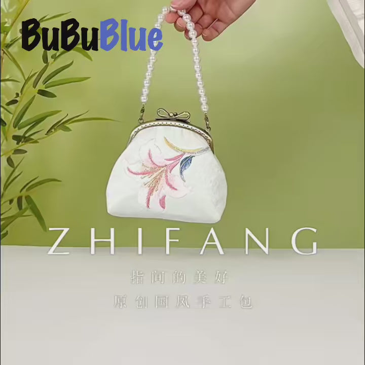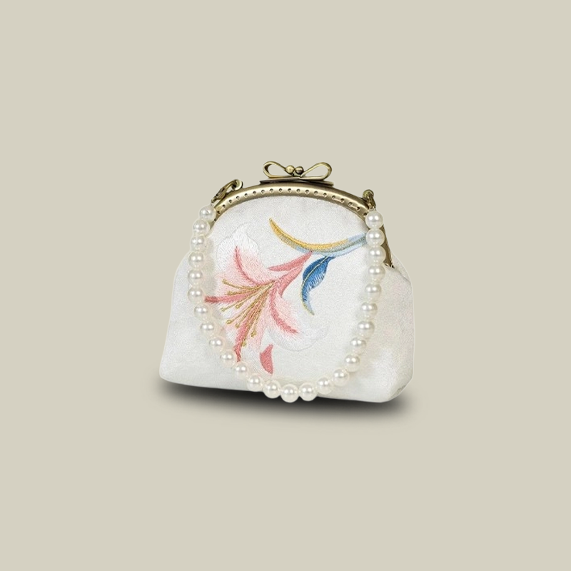 Pearl Chain Lily Embroidered Mini Purse with Bow Metal Kiss-Lock