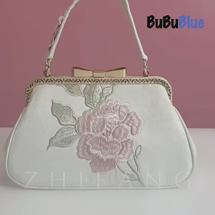 Vintage Begonia Embroidered Square Satin Handbag with Bow Lock