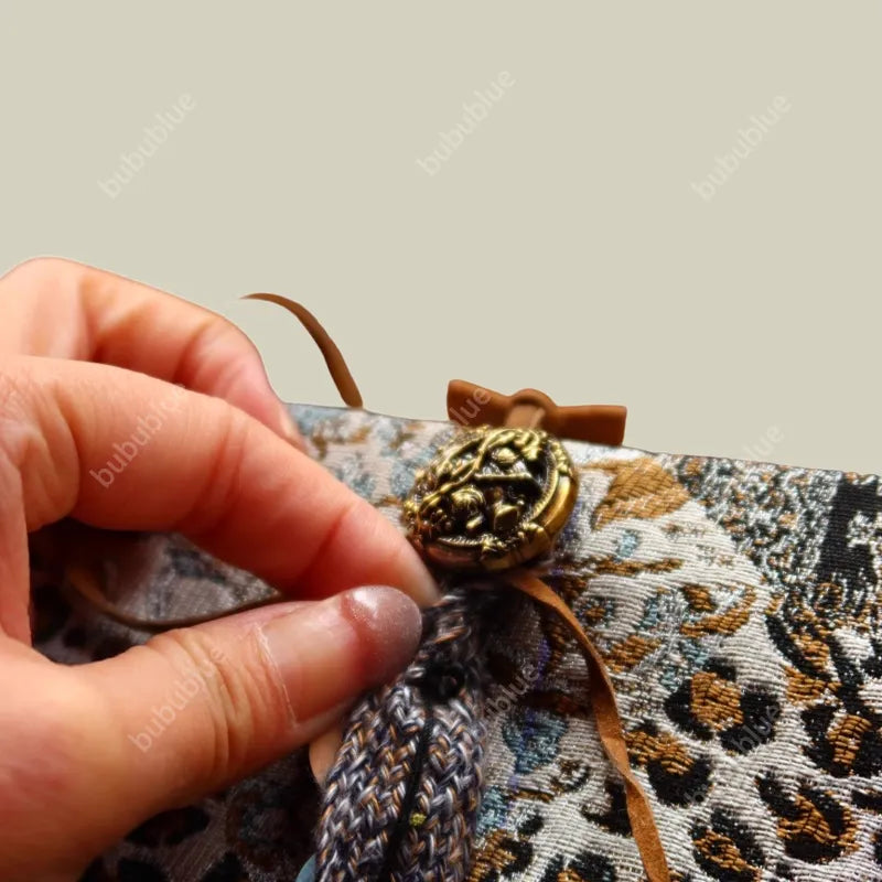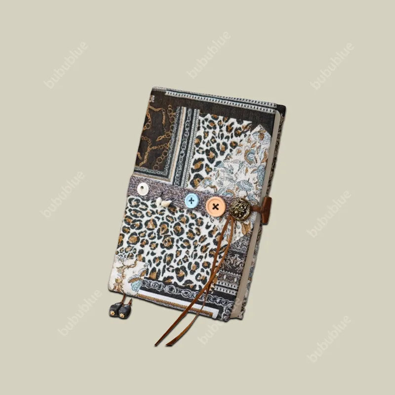 Stitched like a relic from a long journey, this patchwork book cover blends textured jacquards, animal motifs, and vintage symbols into a calm, grounding piece. Each fabric feels timeworn yet warm, finished with hand-tied details and an antique brass button—made to age beautifully with your stories.